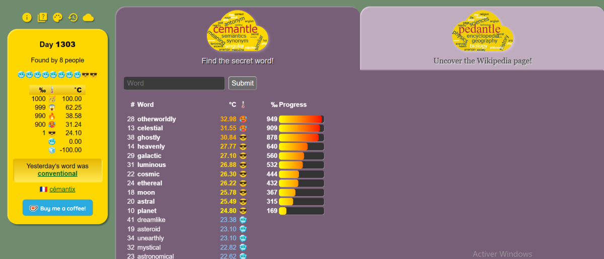 The Cemantle puzzle requires you to find the hidden word. To do so, you'll need to find words until you find a clue to THE precise word. Each word takes on a percentage and temperature index. The more you illustrate the word incognito, the higher the temperature and the higher the value out of 1,000. And the difference with the Cémantix is that the Cemantle is in English ! Perfect for brushing up on your vocabulary.